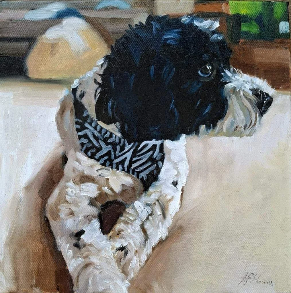 He has a current special available to paint a portrait of your pet from a high quality photo that you provide. The portrait will be 300 mm x 300 mm and will be framed in a Tasmanian Oak box frame. The total cost including frame is $650. Orders can be placed via the Contact page. Use Painting ID: PET